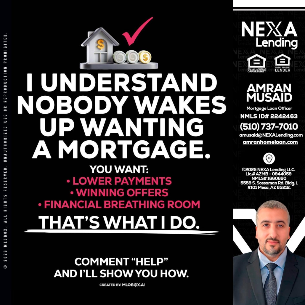 I UNDERSTAND - Amran Musaid -Mortgage Loan OfficerHi, my name is Amran Musaid. I’m a Loan Officer with NEXA Lending LLC., offering personalized mortgage solutions, fast customized quotes, great rates and service with integrity.