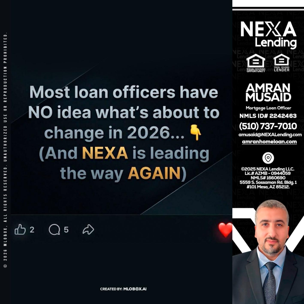 most loan officers - Amran Musaid -Mortgage Loan OfficerHi, my name is Amran Musaid. I’m a Loan Officer with NEXA Lending LLC., offering personalized mortgage solutions, fast customized quotes, great rates and service with integrity.